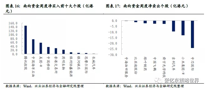南向资金周度净买入前十大个股为腾讯控股(00700)、中国海洋石油(00883)、美团-W(03690)、中国移动(00941)、香港交易所(00388)、药明生物(02269)、保利协鑫能源(03800)、银河娱乐(00027)、思摩尔国际(06969)、长城汽车(02333);净卖出个股为中芯国际(00981)、小米集团-W(01810)、吉利汽车(00175)、舜宇光学科技(02382)、中国飞鹤(06186)、绿叶制药(02186)、比亚迪股份(01211)、中海油田服务(02883)。