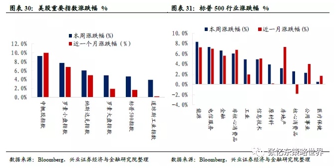 股指表现:本周美股重要指数均上涨。中概股指数(涨9.3%)、罗素小盘指数(涨7.7%)和纳斯达克指数(涨6.0%)领涨,罗素大盘指数上涨4.9%,标普500指数上涨4.6%,道琼斯工业指数上涨3.9%。行业上,重要行业指数均上涨,能源、电信服务和金融领涨。