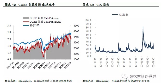 投资者情绪:1)美股个股看涨/看跌期权成交量比例5日移动平均与上周持平为2.4,位于近五年以来的97%分位数水平;2)截至2月5日,VIX指数为20.9,低于上周五的33.1,处于2014年7月以来的77%分位数水平。
