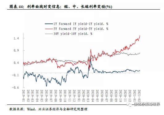 (注:短期货币政策预期,即1Yforward 1Y yield-1Y yield,指的是1年后的1年期国债到期收益率与当前时点1年期国债到期收益率的差,反映了短期(1年期)货币政策预期。同理,5Y forward 5Y yield-5Y yield(中期增长和通胀预期)指的是5年后的5年期国债到期收益率与当前时点5年期国债到期收益率之差,反映中期增长和通胀预期。)
