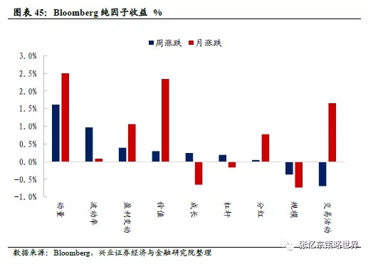 本周,动量(涨1.6%)、波动率(涨1.0%)和盈利变动(涨0.4%)因子领涨,仅交易活动(跌0.7%)和规模(跌0.4%)因子下跌。近一月,动量和价值因子占优,规模和成长因子跑输。