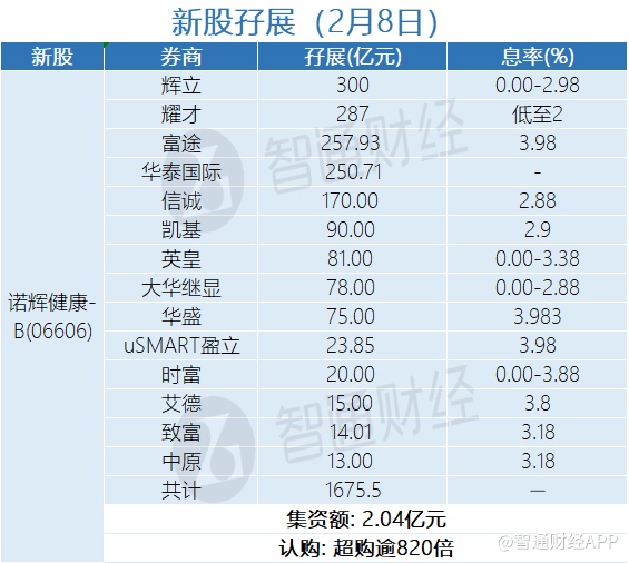 智通财经APP获悉,诺辉健康-B(06606)正在招股中。截至2月8日,辉立、耀才、信诚等合计为其借出1675.5亿港元,超购逾820倍。