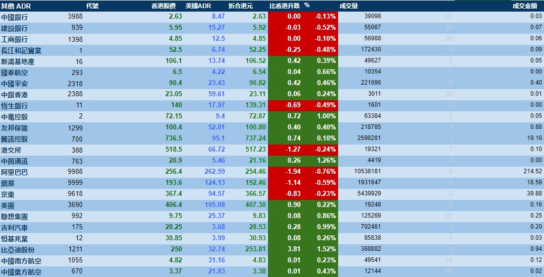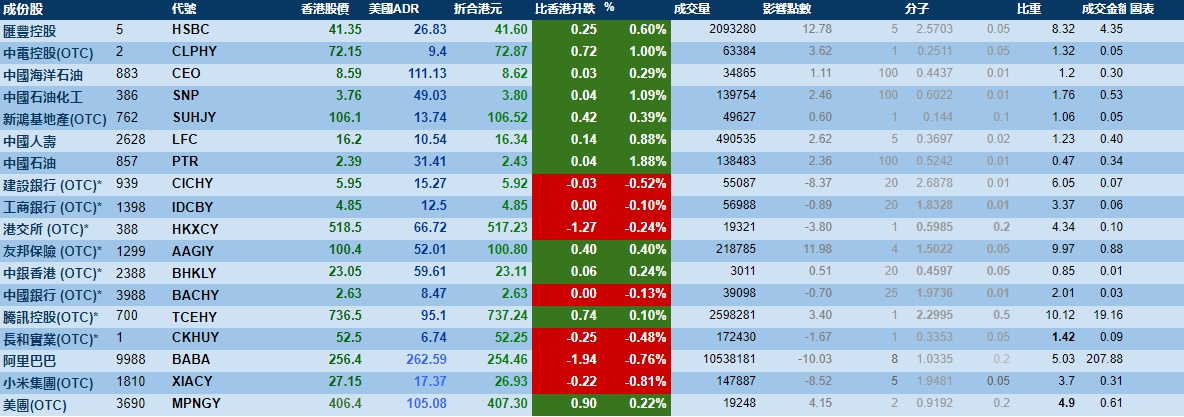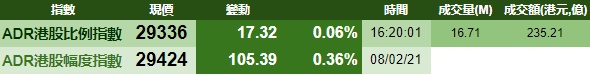 智通财经APP获悉,周一美股三大指数齐涨,港股ADR指数小幅上涨,按比例计算,收报29336点,涨17.32点或0.06%。