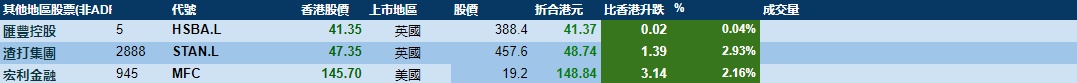 大型蓝筹股涨跌互现,汇丰控股收报41.6港元,较港收市涨0.6%;腾讯控股收报737.24港元,较港收市涨0.1%。具体如下: