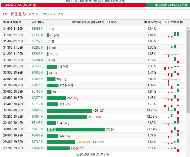 智通财经APP获悉,截至2月9日,恒指最新的牛熊街货比例为77:23。