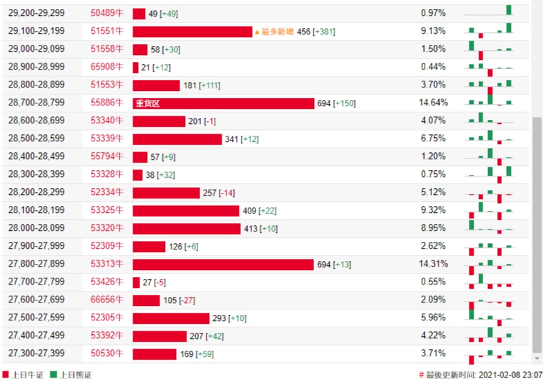 法兴恒指牛熊证街货分布图中的数据显示,熊证街货重货区在30000-30099区间,该区间最新熊证数量为633张,较上一交易日减少3张;最多新增在29800-29899区间,熊证数量为313张,增加109张。牛证街货重货区在28700-28799区间,该区间最新牛证数量为694张,较上一交易日增加150张;最多新增在29100-29199区间,该区间最新牛证数量为456张,较上一交易日增加381张。