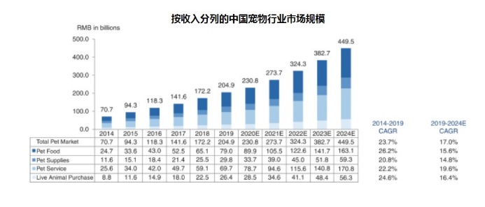 弗若斯特沙利文数据显示,每只猫的年支出和每只狗的年支出已从2019年的3481.6元和5269.4元,增加到2024年的5235.3元和7890.0元。与此同时,宠物市场的规模从2014年的707亿元增加到2019年的2049亿元,复合年增长率以约为23.7%高速增长,预计至2024年市场规模将达到4495亿元,年复合增长率仍保持在两位数以上,为17.0%。