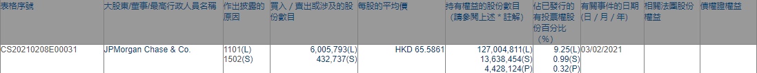 智通财经APP获悉,香港联交所最新资料显示,2月3日,摩根大通增持金山软件(03888)600.5793万股,每股作价65.5861港元,总金额约为3.94亿港元。增持后最新持股数目约为1.27亿股,最新持股比例为9.25%。