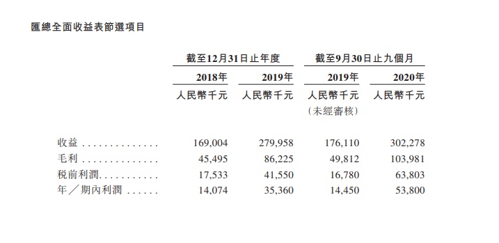 同时,公司利润由截至2018年12月31日止年度的人民币1407.4万元增加151.1%至截至2019年12月31日止年度的人民币3536万元,并由截至2019年9月30日止九个月的人民币1445万元增加271.0%至截至2020年9月30日止九个月的人民币5380万元。