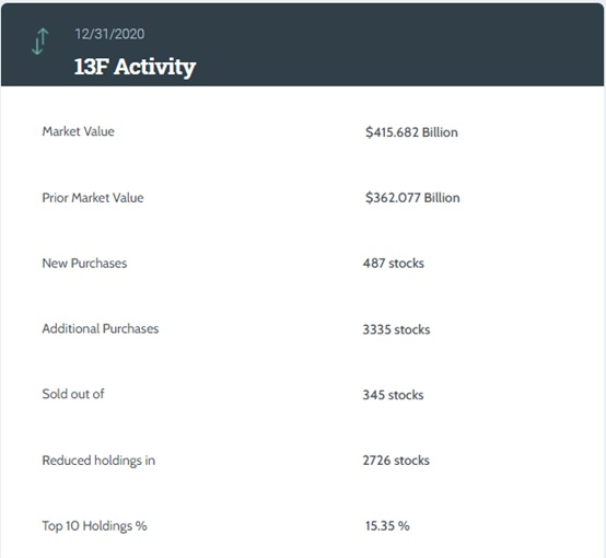 据统计,富国银行第四季度持仓总市值达4156.82亿美元,上一季度总市值为3620.77亿美元,环比增长14.80%。富国银行在第四季度的持仓组合中新增了487只个股,增持了3335只个股。同时,富国银行还减持了2726只个股,清仓了345只个股。其中前十大持仓标的占总市值的15.35%。