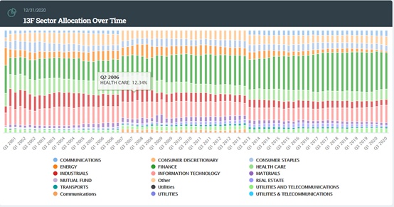 从持仓偏好来看,自2002年以来,金融类、IT、及医疗保健标的在大多时期都占富国银行仓位重头。