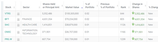 从持仓来看,第四季度,富国银行新买入的标的中,持仓占比前20的标的主要包括维亚特里斯公司(VTRS.US)、Foley Trasimene Acquisition Corp. II (BFT.US)、 Sotera Health Co (SHC.US)、康森哲(CNXC.US)以及PROG Holdings, Inc.(PRG-W.US)。其中大部分属于金融板块,包括个股与基金,其余则多属于IT和医疗保健板块等。