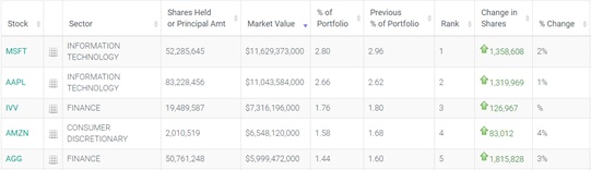 标普500指数ETF-iShares(IVV.US)位列第三,持仓约1948.96万股,持仓市值约73.16亿美元,占投资组合比例为1.76%。第四和第五分别为亚马逊(AMZN.US)和美国全债市ETF-iShares(AGG.US),持仓市值分别约65.48亿美元和59.99亿美元,分别较上季度增长4%和3%。五只标的均有不同比例的增持。