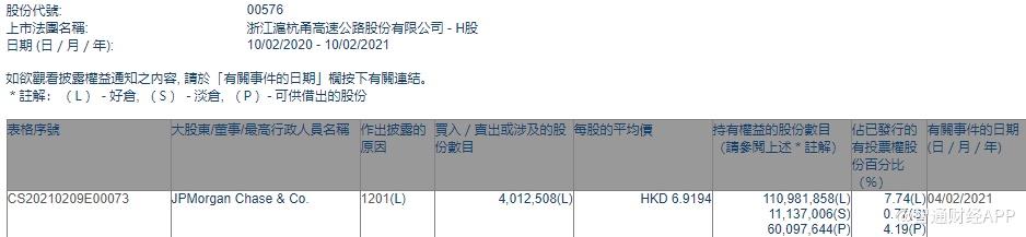 智通财经APP获悉,香港联交所最新资料显示,2月4日,摩根大通减持浙江沪杭甬(00576)401.25万股,每股作价6.9194港元,总金额为2776.4万港元。减持后最新持股数目约为1.11亿股,最新持股比例为7.74%。