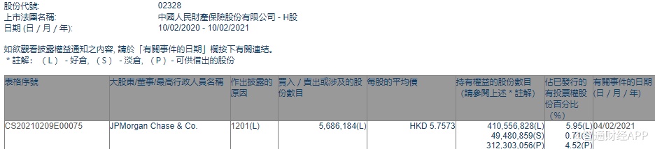 智通财经APP获悉,香港联交所最新资料显示,2月4日,摩根大通减持中国财险(02328)568.6万股,每股作价5.7573港元,总金额为3273.7万港元。减持后最新持股数目约为4.1亿股,最新持股比例为5.95%。