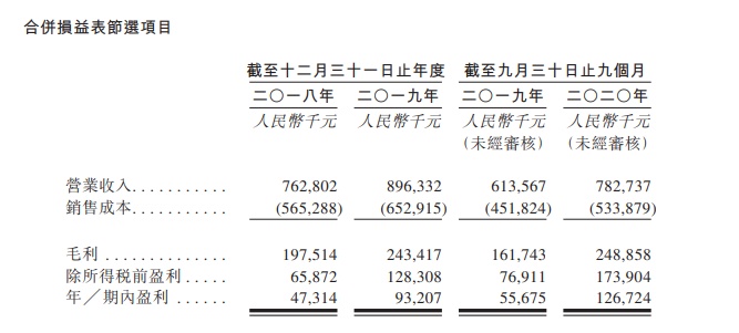 招股书显示,2020前九个月公司营业收入为7.83亿元,同比增长28%;毛利为2.49亿元,同比增长54%;期内盈利为1.27亿元,同比增长128%。