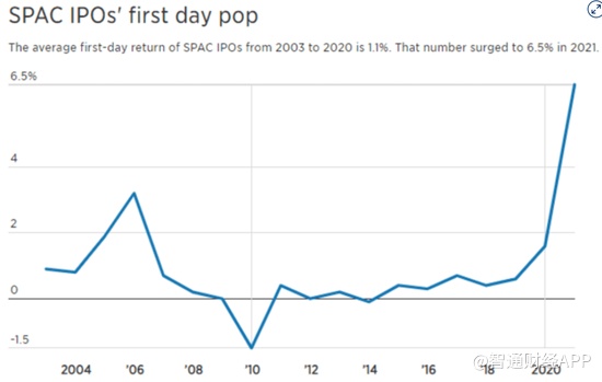 佛罗里达大学金融学教授Jay Ritter表示,今年新SPAC的IPO首日平均涨幅为6.5%,比历史水平增长了近六倍。从2003年到2020年,SPAC的IPO首日平均收益率仅为1.1%。“每一个SPAC上市首日都上涨了,这不是一个特例事件。”