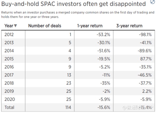 实际上,对于在达成SPAC交易后继续持股投资者而言,他们几乎总是亏损。Ritter表示,在过去10年通过SPAC合并上市的114家公司中,如果投资者在交易首日购买了合并后公司的普通股并持有一年,则平均损失15.6%。如果持有三年,平均损失为15.4%。