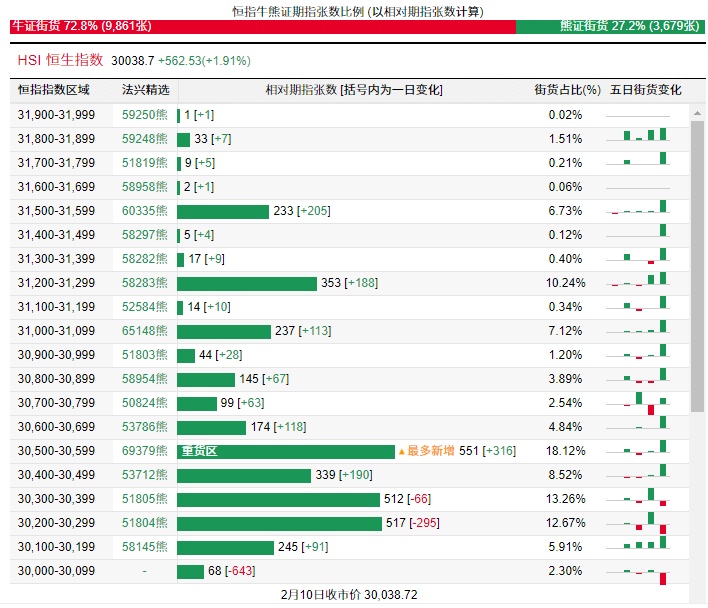智通财经APP获悉,截至2月11日,恒指最新的牛熊街货比例为73:27。