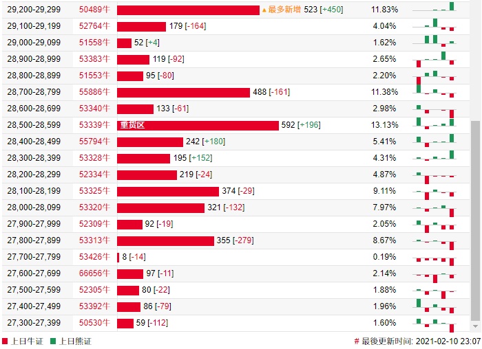 法兴恒指牛熊证街货分布图中的数据显示,熊证街货重货区在30500-30599区间,该区间最新熊证数量为551张,较上一交易日增加316张,最多新增也在该区间。牛证街货重货区在28500-28599区间,该区间最新牛证数量为592张,较上一交易日增加196张;最多新增在29200-29299 区间,该区间最新牛证数量为523张,较上一交易日增加450张。