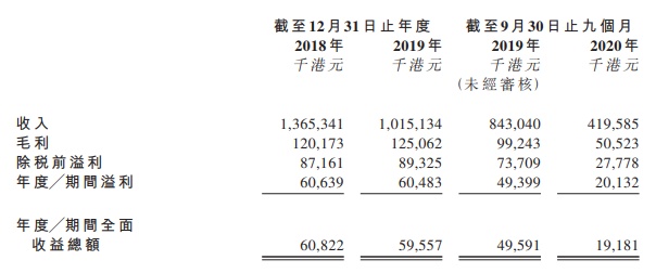 财务业绩方面,该公司的收入主要指销售经加工偏光片产生的毛销售额。截至2018年及2019年12月31日止各年该公司的收入分别约为13.653亿港元及10.151亿港元以及截至2019年及2020年9月30日止九个月分别约为8.43亿港元及4.196亿港元,该公司业务及非流动资产全部位于中国。