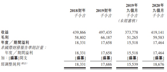 财务业绩方面,该公司的收益由2018财年的约4.399亿令吉增加约13.1%至2019财年的约4.974亿令吉,并由2019年九个月的约3.738亿令吉增加约12.1%至2020年九个月的约4.191亿令吉;于往绩记录期间,该公司的毛利率约为13.4%、13.3%及14.2%。于2018财年及2019财年,毛利率分别稳定于约13.4%及13.3%,并小幅增至约14.2%;于2018财年、2019财年及2020年九个月的经调整净利润分别约为1830万令吉、1770万令吉、1870万令吉。