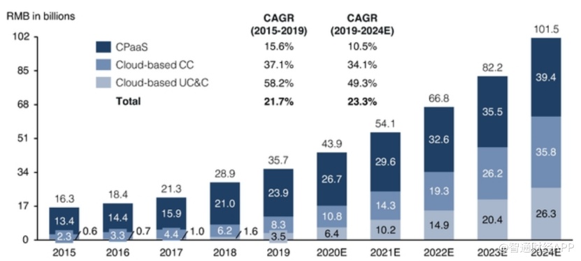 智通财经APP了解到,中国云通信行业的市场规模已从2015年的163亿元增至2019年的357亿元,复合年增长率为21.7%,并预计将在2024年将突破1000亿元。