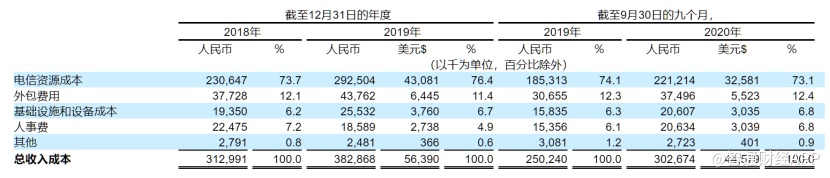 从成本端来看,由于行业发展特性,电信资源成本是公司成本项目中的最核心项目。数据显示,在报告期内电信资源成本分别占公司当期总收入成本的73.7%,76.4%,74.1%和73.1%。
