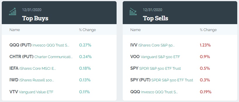 前五大卖出标的分别是:标普500指数ETF-iShares(IVV.US)、标普500指数ETF-Vanguard(VOO.US)、标普500指数ETF-SPDR(SPY.US)、标普500指数ETF-SPDR看跌期权(SPY.US,PUT)和纳指100ETF(QQQ.US)。