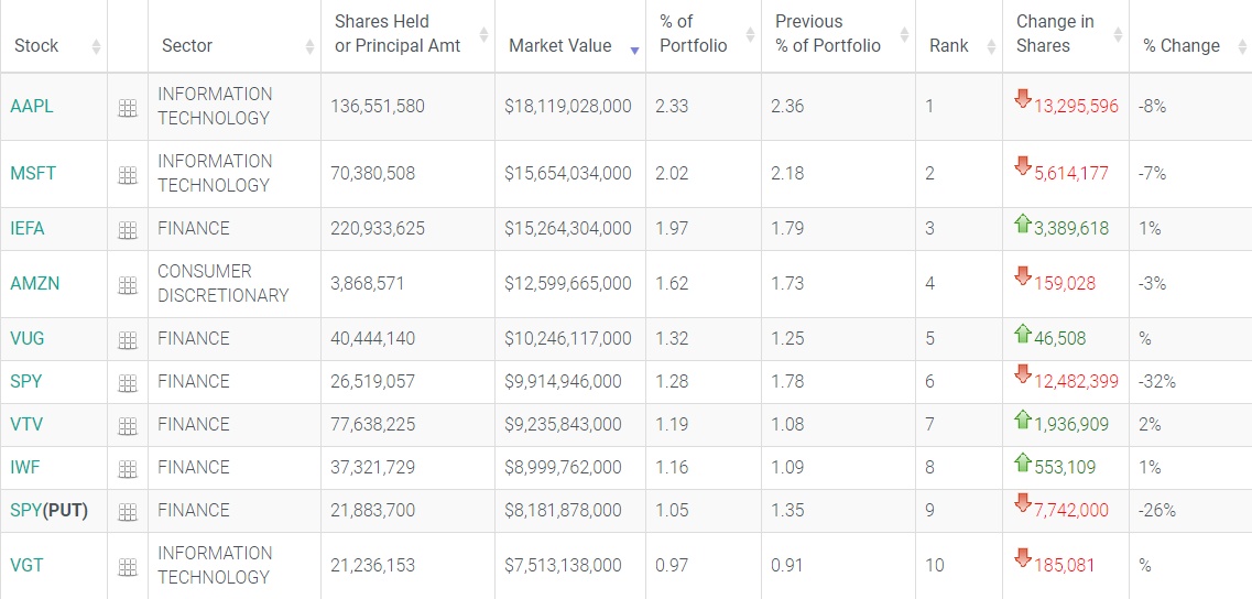 微软(MSFT.US)位列第二,持仓约7038.05万股,持仓市值约156.54亿美元,环比减少了7%。