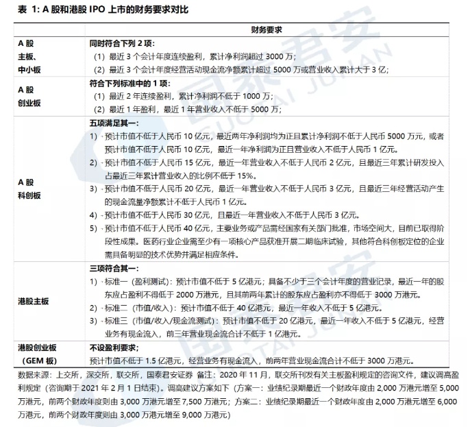 根据交易所披露的上市规则,A股主板、中小板以及创业板均要求拟上市企业实现盈利。而对拟在科创板上市的企业而言,虽然其盈利能力的要求低于主板/中小板与创业板,但是企业必须具备领先的核心技术以及市场认可度。相比之下,港股主板和创业板的财务要求更加宽松。根据联交所披露的上市规则,拟在港股主板上市的企业须符合盈利测试,市值/收入测试,或市值/收入/现金流测试三者之一。即在企业尚未盈利的情况下,如果其市值、收入和现金流满足相应要求,仍然可以在港股主板发行上市。而港股创业板财务要求更低,对拟上市企业无盈利和收入要求,只须其市值和现金流符合条件即可,使得一些盈利能力不足且业务前景较差的企业也能在港股寻求上市。