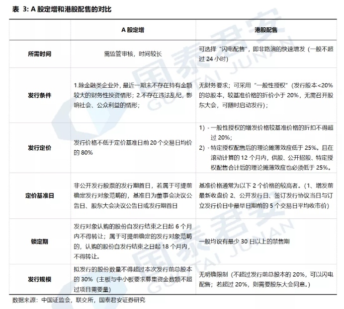 2)港股对拟启动配售的上市公司无明确财务要求,不需监管机构对企业审查。A股定增要求企业最近一期末不存在持有金额较大的财务性投资情形(除金融类企业外),而港股配售无特定的明确要求。