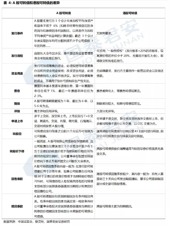 3)港股可转债转股更快。通常港股可转债发行日期后第41日即可进行转股,部分公司可转债在发行结束后即可转股,而A股可转债转股日一般为可转债发行结束之日满六个月后的第一个交易日。