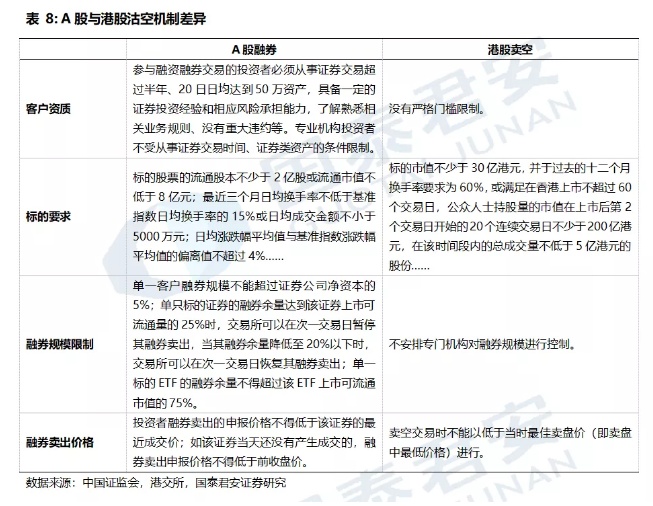 沽空,即做空,指的是操作者预期股票价市场会下跌,将手中借入筹码按市价卖出,待其下跌之后再买入归还,赚取中间差价。香港于 1994 年开始允许股票沽空,领先 A 股的融资融券业务 16 年。与 A 股融券业务类似,香港禁止“裸卖空”,即未借入证券的沽空行为。港股沽空与 A 股沽空的主要差异在于两点:第一是港交所对沽空交易限制更少,例如不对客户资质设立严格的门槛、不安排专门机构对融券规模进行控制;第二是港交所除了融券可实现沽空外,还可以通过涡轮、牛熊证等丰富的工具实现沽空。