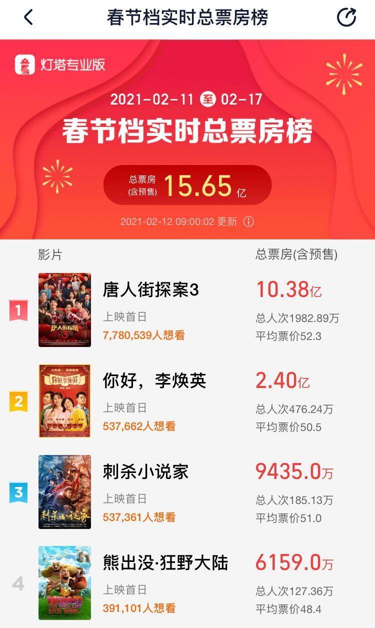 根据灯塔专业版实时数据,截至2月12日9时,2021年春节档实时预售总票房达15.65亿。过去仅9个小时,总票房便增加了1个亿。