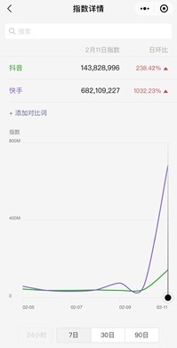 微信(00700)指数或许更加能够说明问题。2月11日,快手的微信指数日环比上升1032.23%。尤其在微信朋友圈,快手春节活动的感知度较强。