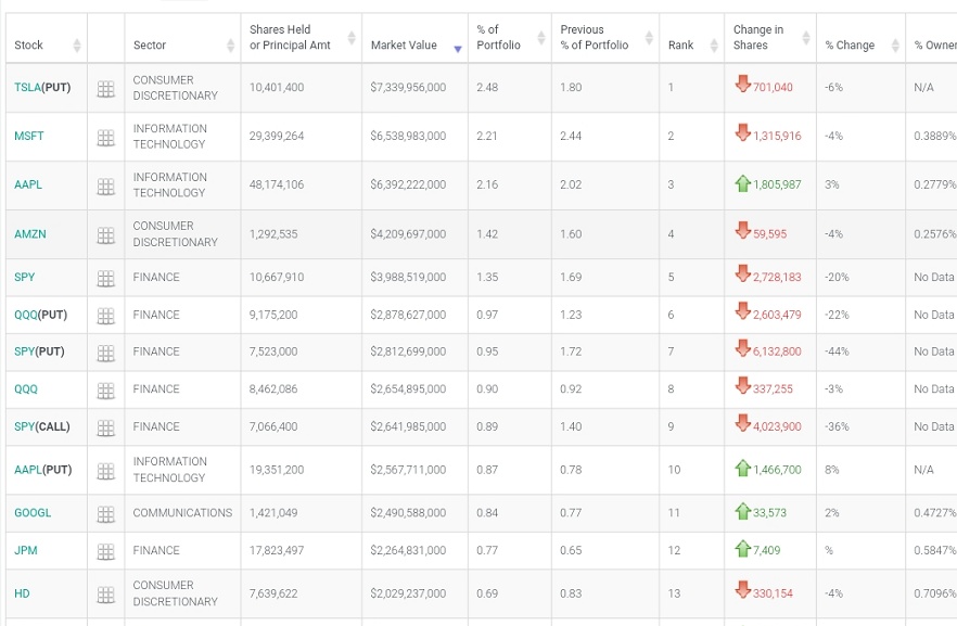 瑞银集团前五大重仓股依次是特斯拉看跌期权(TSLA.US,PUT)占投资组合比例为2.48%、微软(MSFT.US)占投资组合比例为2.21%、苹果(AAPL.US)占投资组合比例为2.16%、亚马逊(AMZN.US)占投资组合比例为1.42%、标普500指数ETF(SPY.US)占投资组合比例为1.35%。
