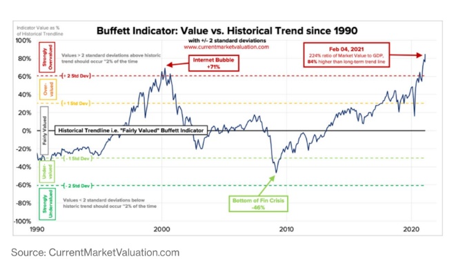 这个巴菲特最爱的估值指标其实是一个简单的比率:用美国股市的总市值除以美国GDP的美元总值。