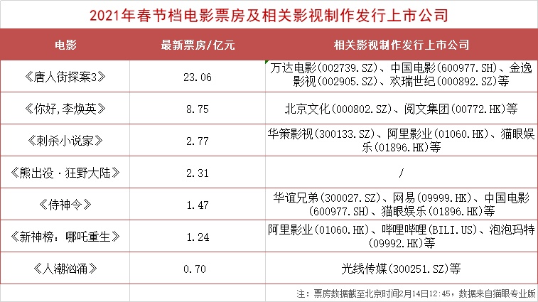 票房火爆,直接获益的将是背后参与制作的影视公司,在2020年业绩普遍出现亏损的情况下,相信2021年业绩会有所改善。现不完全梳理春节档电影相关影视制作公司,供读者参考。