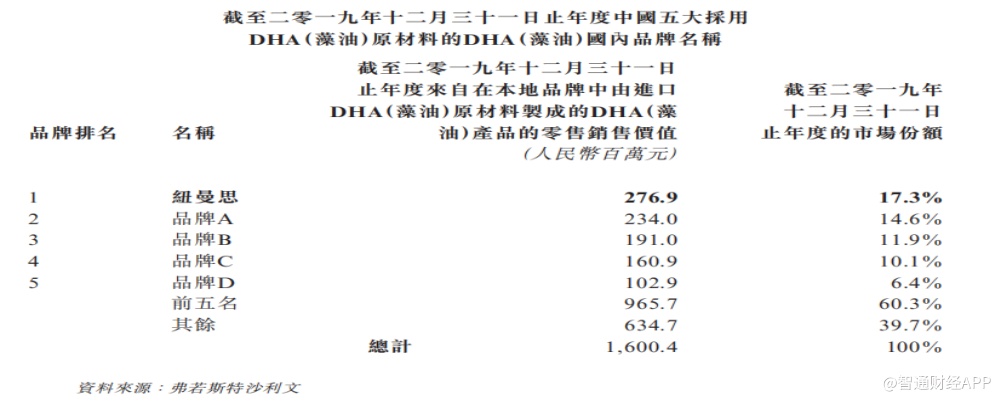 据弗若斯特沙利文报告,2019年,国内品牌中,以进口成品DHA(藻油)原材料制造的DHA(藻油)产品销售额计算,纽曼思市场份额位列第一,约为17.3%。