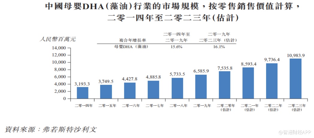 其中母婴DHA作为保健品市场主要赛道之一保持了长期快速发展势头。零售销售价值由2014年的31.93亿元增加至2019年的65.86亿元,复合年增长率为15.6%。预计市场规模于2023年达到109.84亿元,2019年至2023年期间的复合年增长率为13.6%。面对消费升级,于中国市场购买的母婴DHA(藻油)产品的平均价格估计将相应地增加。弗若斯特沙利文认为,从需求端开始,摄取DHA的益处于中国市场逐步培养,增加产品的渗透率,尤其是渗透至较低级别城市,显示未来有上升需求。