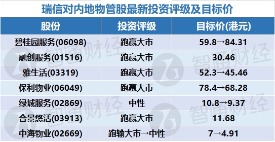 智通财经APP获悉,瑞信发表研究报告,对内地物管股最新目标价及评级如下: