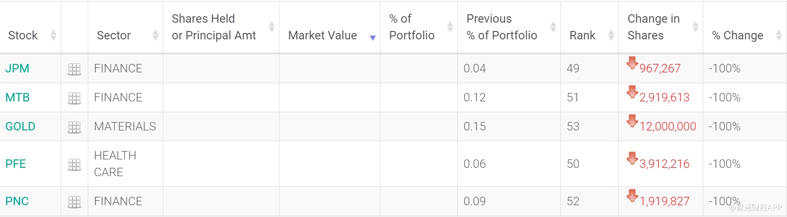 清仓巴里克黄金公司(GOLD.US)、美国制商银行(MTB.US)、PNC金融(PNC.US)、摩根大通(JPM.US)以及辉瑞(PFE.US)。