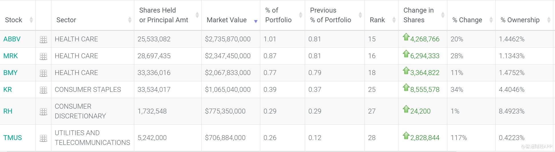 增持117%T-Mobile US Inc(TMUS.US)至524.2万股,以及三家医药公司艾伯维(ABBV.US)、默沙东(MRK.US)、施贵宝(BMY.US)等。