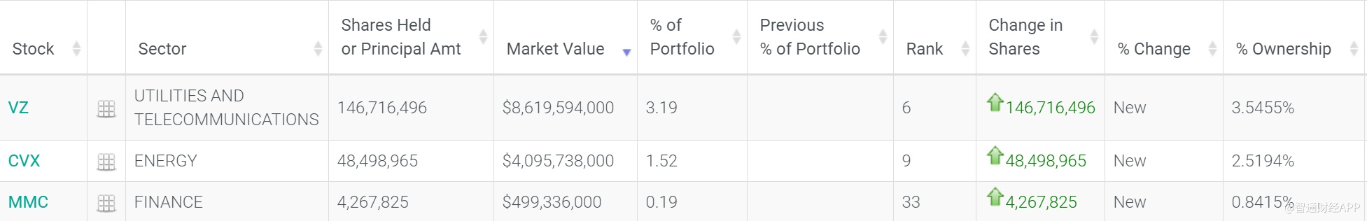 新建仓Verizon(VZ.US)、雪佛龙(CVX.US)、威达信集团(MMC.US)。