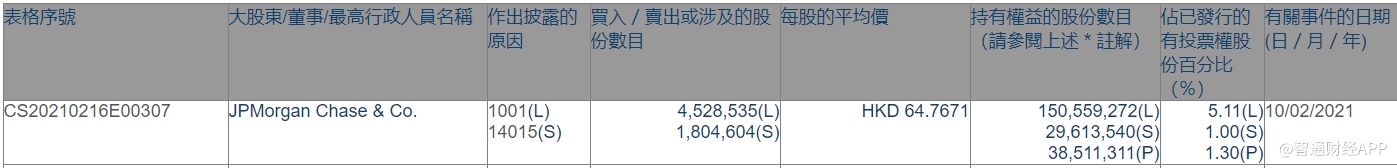 智通财经APP获悉,香港联交所最新资料显示,2月10日,摩根大通增持碧桂园服务(06098)约452.85万股,每股作价64.7671港元,总金额约为2.93亿港元。增持后最新好仓持股数目约为1.51亿股,最新持股比例为5.11%。