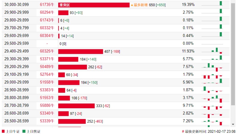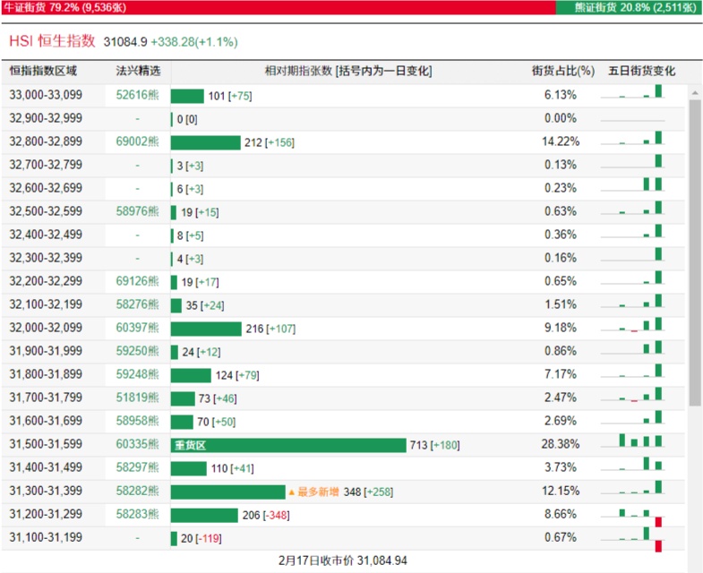 法兴恒指牛熊证街货分布图中的数据显示,熊证街货重货区在31500-31599区间,该区间最新熊证数量为713张,较上一交易日增加180张,最多新增在31300-31399区间,熊证数量为348张,增加258张。牛证街货重货区在30000-30099区间,该区间最新牛证数量为650张,较上一交易日增加650张。最多新增也在该区间。