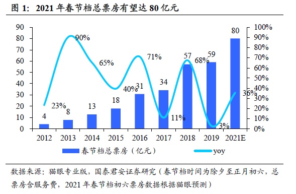 2021年春节档票房有望达80亿元左右,“史上最强春节档”名副其实。截止2021年2月16日24点,春节档前6天票房(含预售票房及服务费)已达70亿元以上,若参考猫眼专业版对2021年2月17日近10亿元的票房预测,则2021年春节档票房有望达80亿元左右,相比2019年增长35%左右。疫情后我国电影产业强势复苏,电影票房再现较快增长。