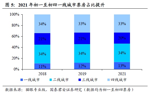 从城际角度来看,2021年春节档一线城市票房占比明显提升。根据猫眼专业版的数据,我们区分城际统计了2018/2019/2021年初一至初四总票房数据,结果显示2021年春节档统计区间内一线城市票房占比达13%,高于2018和2019年的11%和12%。疫情和返乡政策推动一线城市2021年春节档火热。
