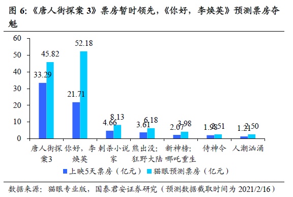 《唐人街探案3》票房领跑,《你好,李焕英》口碑逆袭,万达院线优势明显。《唐人街探案3》上映首日票房达10.15亿元,创下全球首日票房纪录,上映4天票房突破30亿元,率先引爆春节档。《你好,李焕英》在初三开始口碑发酵,排片占比超过25%,至大年初五票房占比突破50%,根据猫眼的票房预测,《你好,李焕英》内地总票房有望超过50亿元,成为仅次于《战狼2》票房的影片。同时,2021年春节档初一至初三,万达电影在全国院线市占率达13%,领先其他各大院线,优势明显。